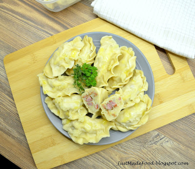 Pierogi z ziemniakami, to nie tylko ruskie. Ziemniaki świetnie komponują się z podsmażonym boczkiem i kiełbaską. W takim połączeniu, oprócz cebulki, nie potrzebują żadnych dodatków. Chociaż podane z sosem pomidorowym, również były przepyszne!