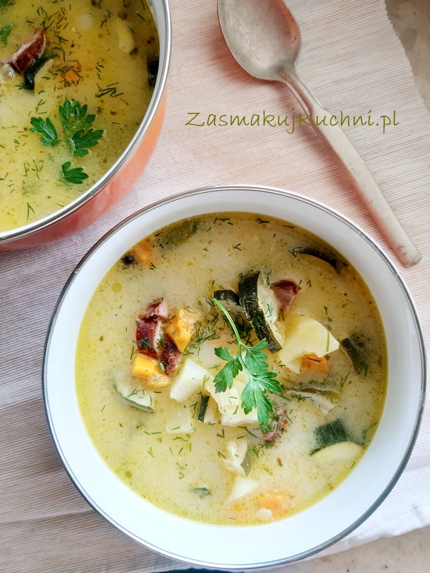 Zupa z cukinią i kiełbasą to szybka i prosta propozycja na pierwsze danie lub kompletny obiad. Najlepsza jest na drugi dzień. Jeśli chcesz możesz zrezygnować z kiełbasy całkowicie lub zastąpić ją kawałkami piersi kurczaka – wtedy uprzednio wcześniej lekko podsmaż je na niewielkiej ilości oleju lub masła i dodaj do