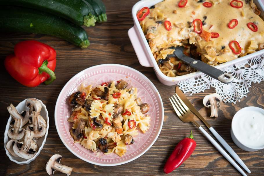 Domowa zapiekanka makaronowa z kurczakiem, pieczarkami i papryką to pyszny pomysł na…