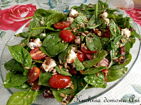 Składniki: 1 paczka świeżego szpinaku typu babykilka pomidorów suszonych z zalewy olejowej świeże pomidorki koktajlowesuszona żurawinaser mozzarella lub typu fetaprażony słonecznik