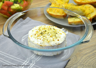 Rozpływający się, płynny camembert, oraz chrupiące serowo-ziołowe grzanki. Wygląda niewinnie, a to bardzo sycące danie! Fajnie jest kupić ser w drewnianym pudełku, zszywanym, a nie klejonym. Wtedy można od razu ser upiec w tym pudełku. Moje opakowanie okazało się sklejone klejem, więc przeniosłam je do