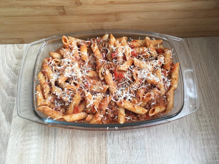 400 gram mielonej wołowiny1 czerwona papryka1 większa cebula1 słoik passaty pomidorowejok 350 gram makaronu, u mnie peneprzyprawy: sól, pieprz, słodka, ostra papryka,