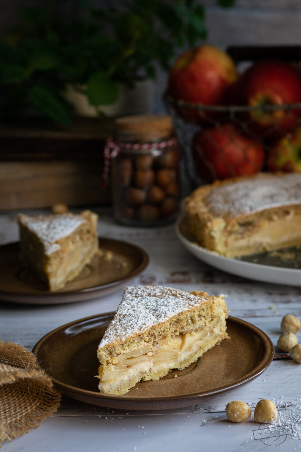 To idealny, jesienny wypiek. Kruchy, orzechowy spód. Plasterki jabłek. Delikatny biszkopt na wierzchu.