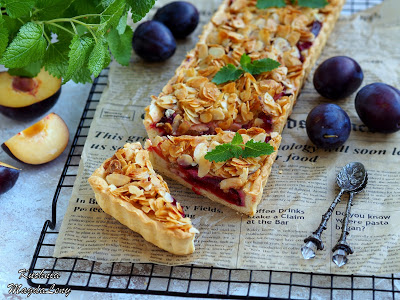 Tarta w stylu francuskim. Wykonana z ciasta półkruchego, z dodatkiem smażonych śliwek, zalanych waniliową masą śmietanowo-jajeczną oraz posypką z płatków migdałowych na wierzchu. Po zapieczeniu otrzymamy pyszne, kremowe nadzienie śliwkowe z chrupiącą kruszonką migdałową.