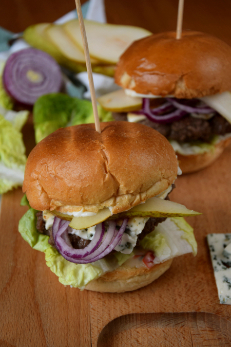 Kolejna odsłona soczystych burgerów na blogu, w tej wersji z pikantnym wyrazistym niebieskim serem i świetnie do niego pasującą gruszką, chrupiącą sałatą rzymską i pikantną czerwoną cebulą. Połączenie, któremu ciężko się oprzeć, proste a jednocześnie trochę wyszukane. Wypróbujcie koniecznie i pokochajcie.