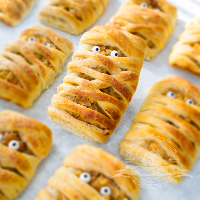 Niedługo Halloween. Więc muszą być jakieś straszliwe wypieki 🙂 Dzisiaj zaproponuję pyszne, mięciutkie, drożdżowe bułeczki – imitujące zawinięte bandażami mumie. Nadzienie z dyni i jabłek z delikatnym cynamonowym aromatem, doskonale komponuje się z ciastem drożdżowym, a jego zapach podczas pieczenia wypełnia w cudowny sposób, cały dom. Drożdżówki są na tyle
