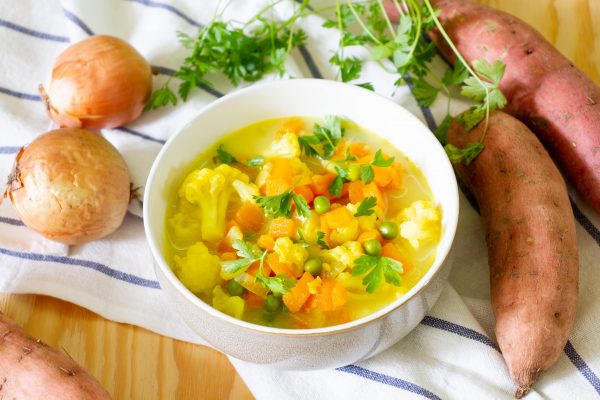 Zupa z kalafiora, słodkich ziemniaków i groszku to sycące danie jarskie, które…