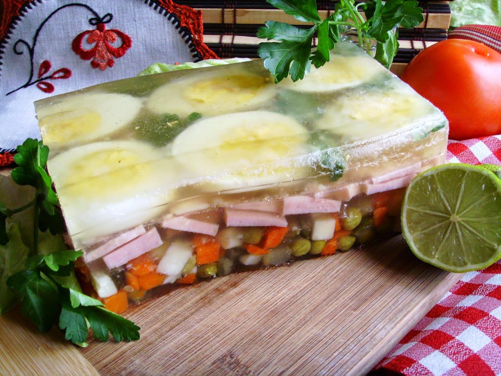 Galareta z szynką, jajkami i warzywami. Smaczna i efektowna.