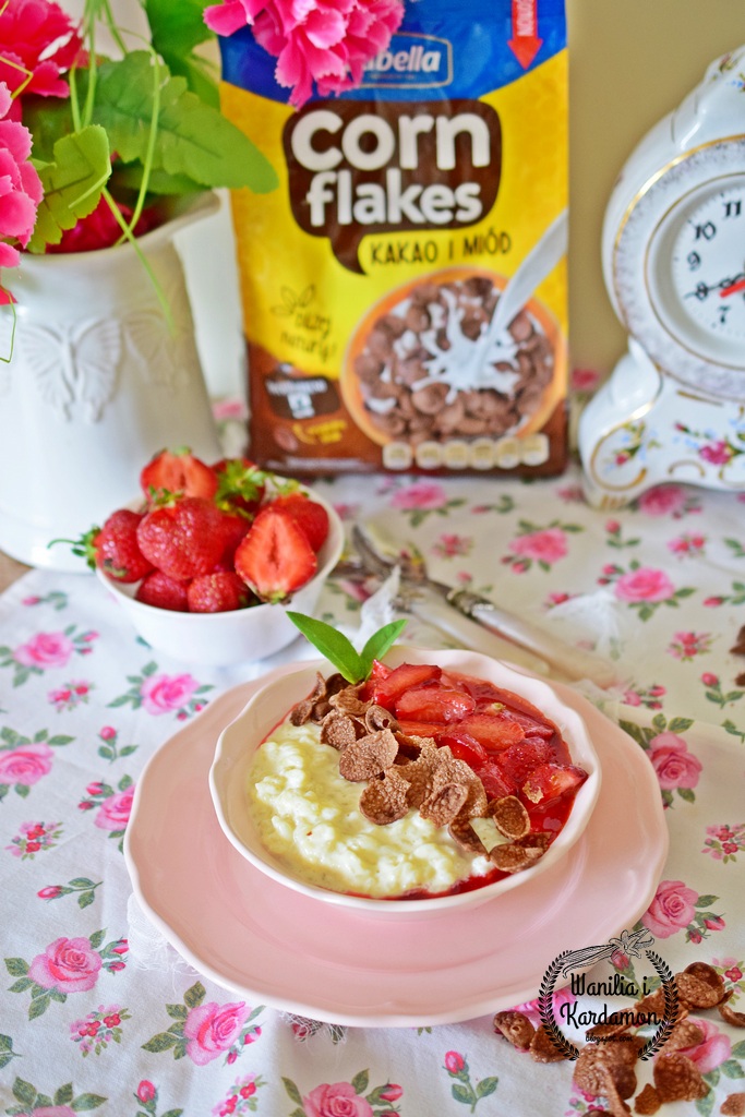 Słodkie risotto z mlekiem szałwiowym, karmelizowanymi truskawkami i płatkami