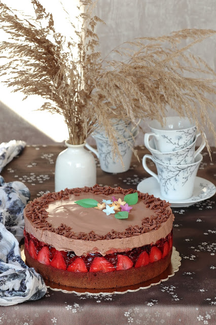 Ciasto z galaretką z truskawkami i musem czekoladowym jest nie tylko smaczne, ale również świetnie się prezentuje. Mi udało się je przygotować z mrożonych truskawek, ale najlepsze będą bez wątpienia świeże. Każdą z warstw ciasta przygotowuje się banalnie prosto. Najlepiej w celu dodawania kolejnych warstw wykorzystać wysoką obręcz.