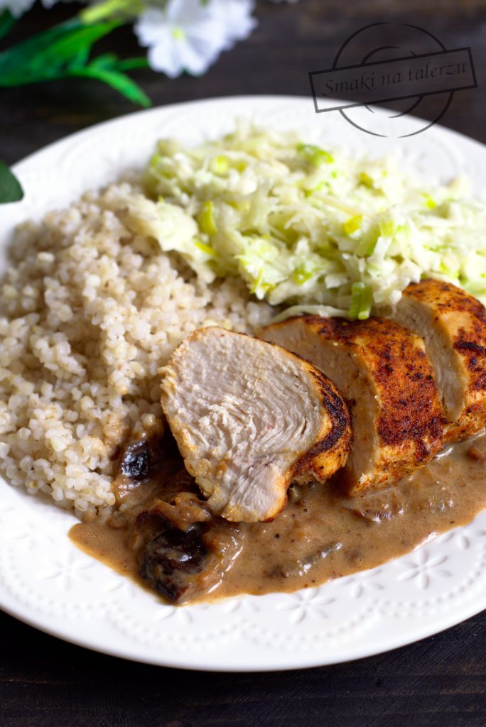 Szukając pomysłu na niebanalny, a jednocześnie prosty obiad, postanowiłam przygotować pieczone piersi kurczaka z kaszą i śliwkowym sosem. Lekko ostrawa surówka z kapusty, pora i jabłka dopełniała całości. Wyszło wyśmienicie.