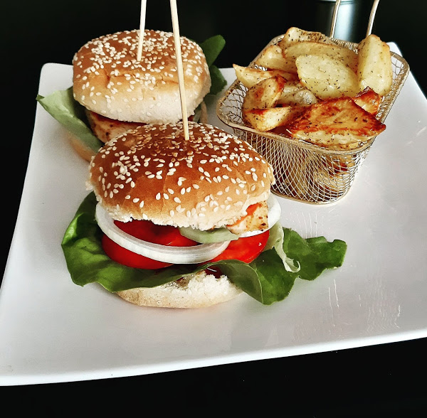 Hamburgery z grillowanym kurczakiem i domowymi frytkami z piekarnika Składniki:4 bułki do hamburgerów z sezamem400 g kurczaka1 pomidor pół ogórka zielonego1 mała cebulakilka liści sałatymajonezketchup Domowe frytki:1 kg ziemniaków2-3 łyżki olejupół łyżeczki solipół łyżeczki suszonego rozmarynu Sposób wykonania:Filet z kurczaka przekroić w poprzek na 4 cienkie filety. Doprawić solą, pieprzem.