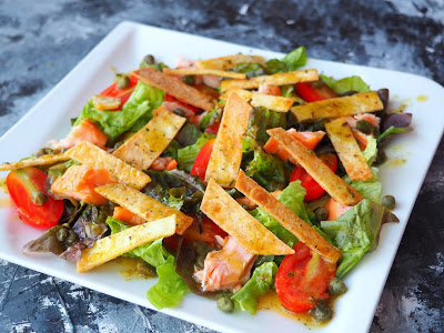 Sałatka jest przepyszna i jak w tytule książki podano, to tylko 5 składników: dynia, harissa, awokado, mieszanka sałat i mozzarella.