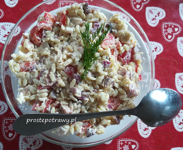 15 dag dość chudego, wędzonego boczku1 czerwona papryka1 czerwona cebula10 dag makaronu podobnego do ziaren ryżukoperekmajonez2 ząbki czosnku, słodka mielona papryka, pieprz mielony czarny