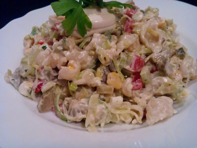 Pyszna kolorowa sałatka z makaronem, porem, papryką , ogórkiem konserwowym i selerem…