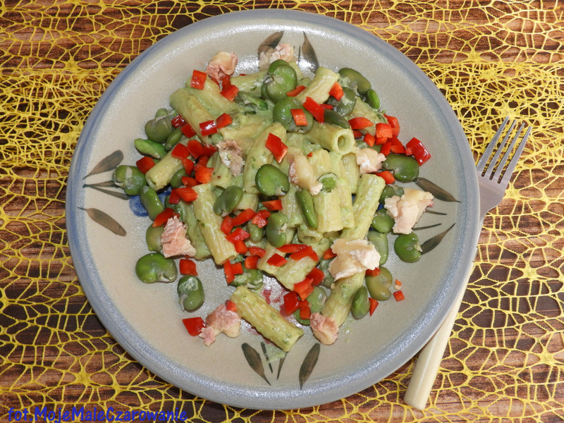 Makaron obtoczony pysznym sosem i dodatkowo bobem posypany, pyszności.W sezonie używam bobu…