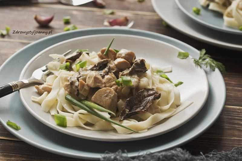 Makaron z piersią z kurczaka w sosie grzybowym. Pieczarki, suszone grzyby i pierś z kurczaka w kremowym sosie z dodatkiem makaronu to marzenie wszystkich miłośników makaronu i