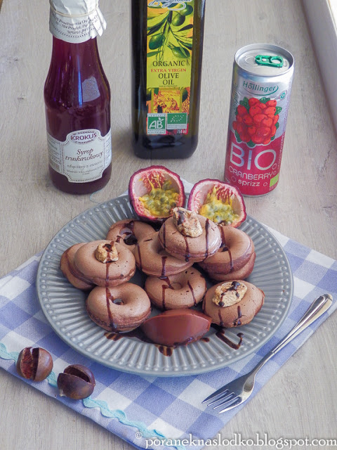 ***DONUTY „TRUSKAWKA W CZEKOLADZIE”/przepis własny/Składniki:45 g ekologicznej mąki pszennej graham10 g zmielonych…