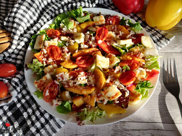 Przygotowałam sobie mega pyszną sałatkę z mixem sałat, grillowanym serem halloumi, grillowanymi pomidorkami i brzoskwiniami a na całości posypany lunch mixem składającym się z kaszy owsianej, bulgur, ryżu parboiled i czerwonego. Tylko chwila pracy a sałatka jest doskonała na 2 śniadanie, lekką kolację lub można ją zapakować w pudełko i