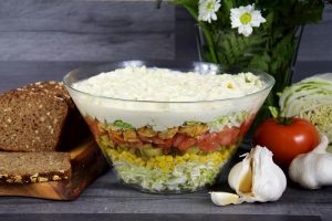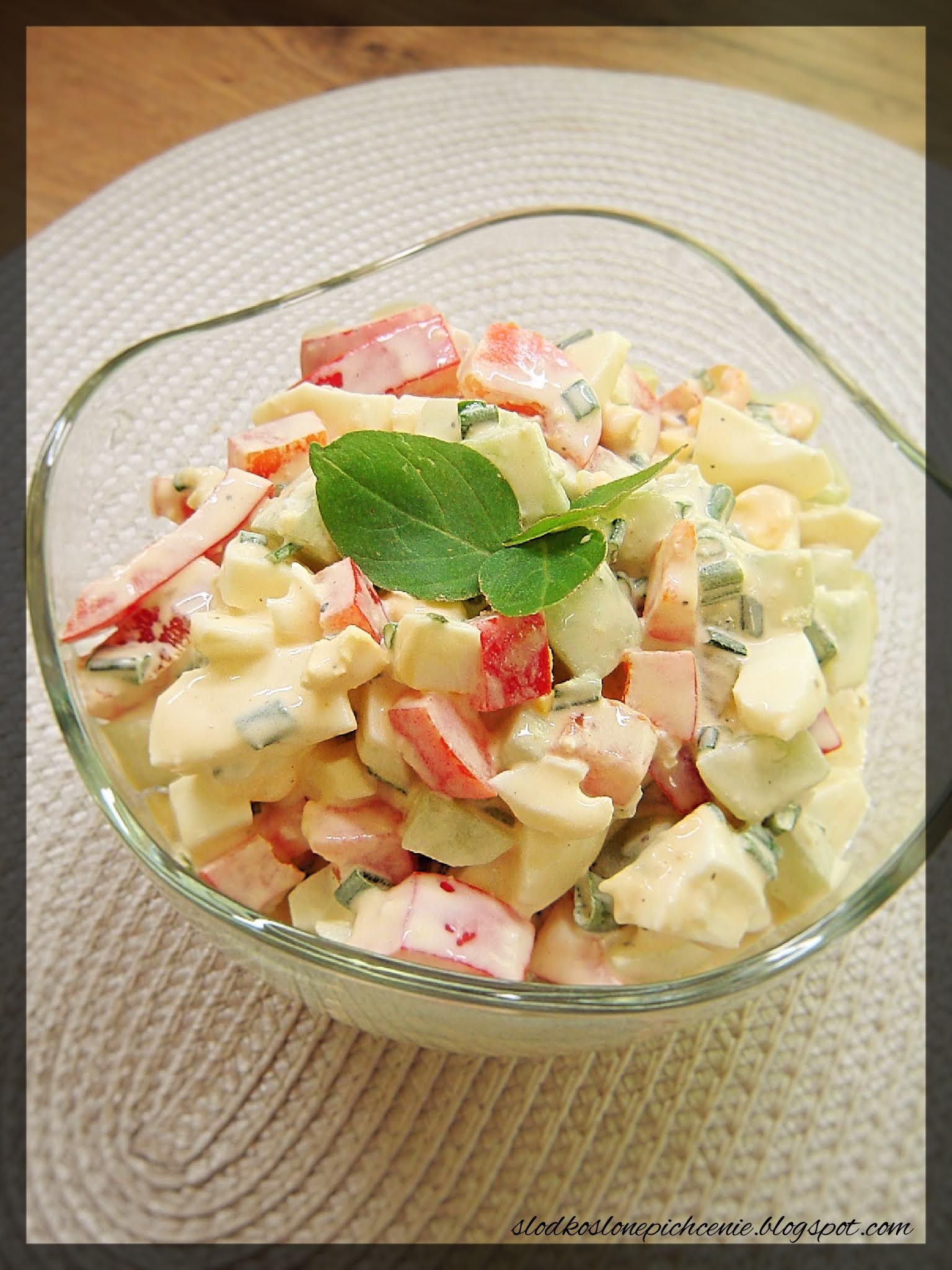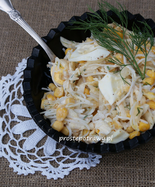 Składniki : ok 50 g makaronu ryżowegopuszka kukurydzysłoiczek selera konserwowego5 jajkoperekmajonezsól, pieprz…