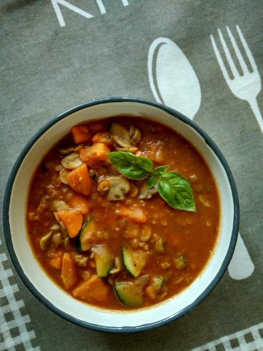 Gulasz z batatami, czerwoną soczewicą, pieczarkami i cukinią