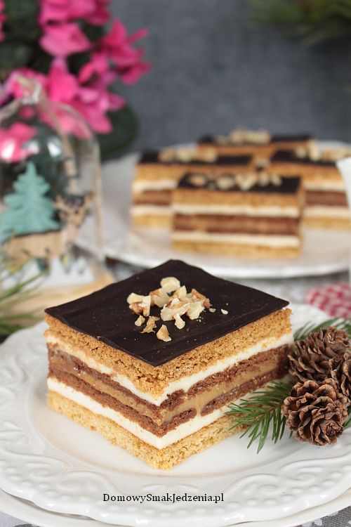 Z podanych składników zagniatamy ciasto. Dzielimy na dwie równe części. Każdą cienko rozwałkowujemy na wielkość foremki (ok.22×32 cm, miara dna). Przekładamy do formy wyłożonej papierem do pieczenia. Pieczemy w ok.