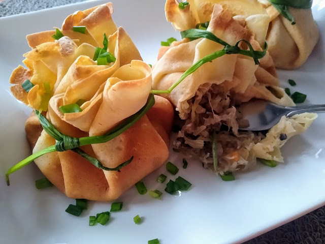 Święta zbliżają się wielkimi krokami. Dziś proponuję sakiewki z kiszoną kapustą z pieczarkami zamiast tradycyjnych krokietów. Wyglądają bardzo elegancko a robi się je znacznie szybciej niż krokiety, a co najważniejsze mniej kaloryczne. Na wigilię z czerwonym barszczem rewelacja.