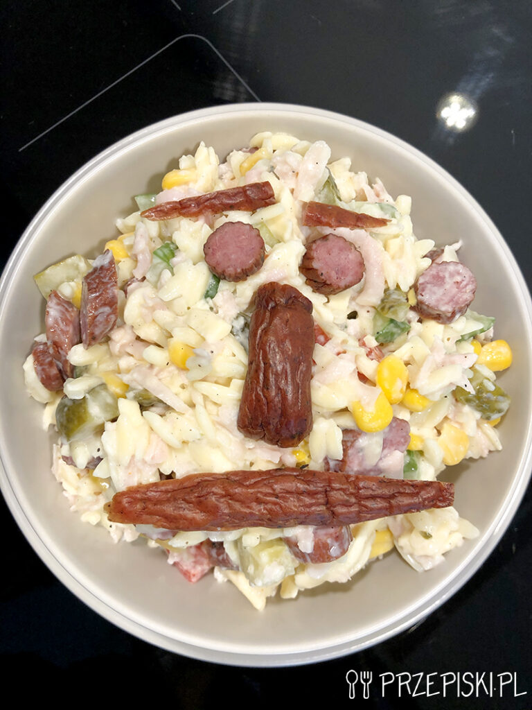 Sałatka z makaronem i kabanosem to świetna propozycja na kolację, a także domową imprezę. Sałatka ma bardzo wyrazisty smak, jest lekko pikantna, idealna na różnego rodzaju spotkania ze znajomymi, szczególnie z dodatkiem napoi wysokoprocentowych.