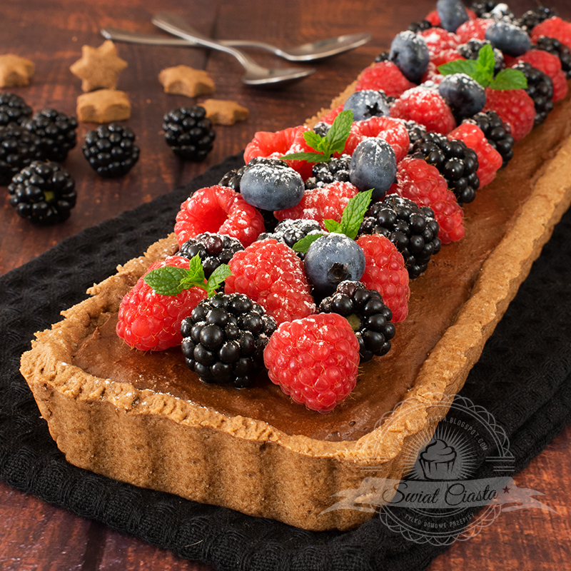 Kruchy, kakaowy spód, wypełniony cienką warstwą konfitur z malin oraz delikatnym, jak…