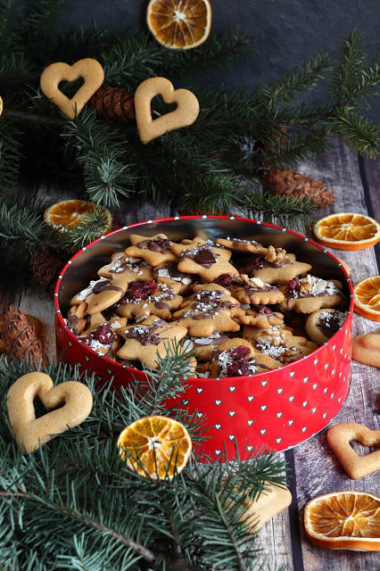 Pieczę korzenne pierniczki z tego przepisu co roku. Są kruche, pyszne i nie wymagają leżakowania, dzięki czemu można się nimi zajadać od razu po upieczeniu. W tym roku piekłam również wersję z wycinanym środkiem na choinkę. Pozostałe pierniczki według naszej rodzinnej tradycji dekoruję zawsze polewą czekoladową, bakaliami, orzechami i