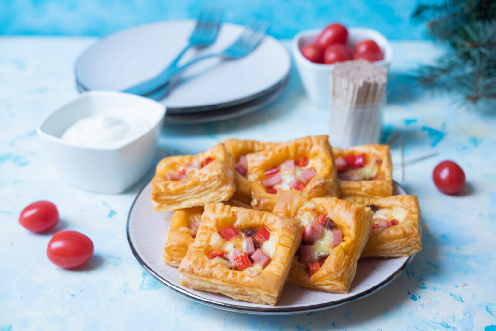 Ekspresowe przekąski z ciasta francuskiego są idealne na Sylwestra czy zwykłą domówkę! To chyba najłatwiejsza i najtańsza przekąska imprezowa jaka tylko może być. Do tego wystarczy tylko kilka minut, aby przygotować te przekąski z ciasta francuskiego. Moja propozycja jest taka żeby pokroić ciasto francuskie w kwadraciki i na środku każdego