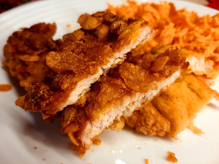 Co można przyszykować z piersi indyka? Na przykład pyszne kotlety w chrupiącej panierce z płatków kukurydzianych lub mąki kukurydzianej. Do tego smaczna sałatka i obiad gotowy 🙂