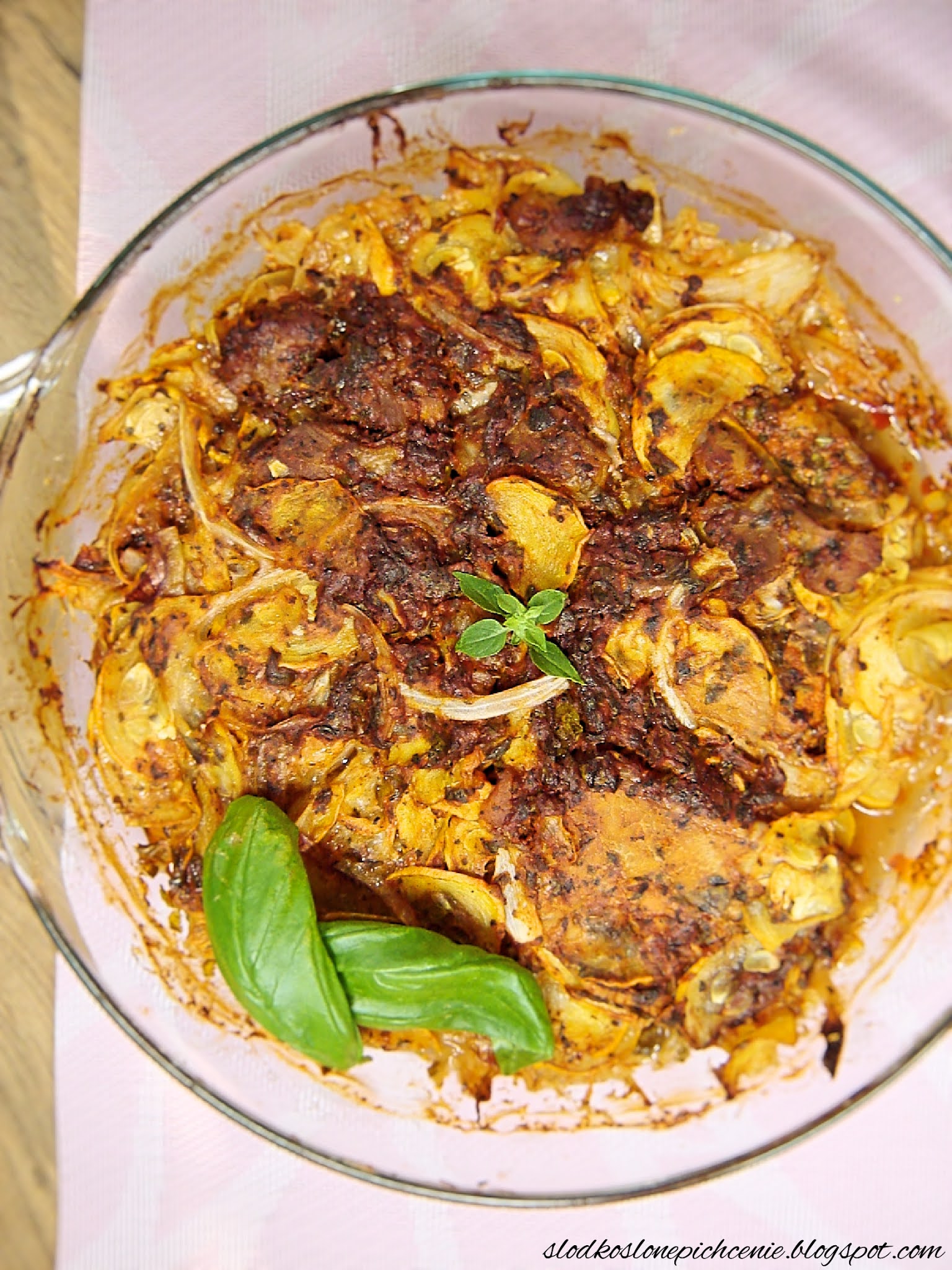 Plastry schabu zamarynowane w aromatycznej marynacie, zapieczone z cukinią i cebulą to pyszne danie jednogarnkowe, które posmakuje każdemu.