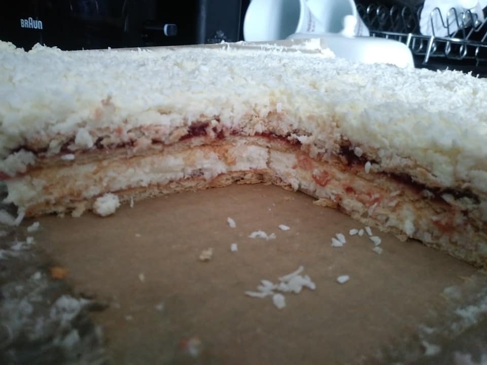 500 ml śmietany 30 lub 36%200 gram białej czekolady – ja kupiłam w biedronce białą z wiórkami kokosowymi1 princessa kokosowa long2 łyżki wiórek kokosowych1 śmietana w proszku fix