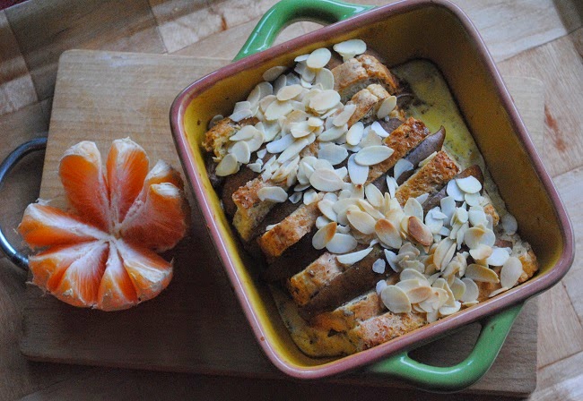 558. Waniliowy pudding chlebowy z gruszką, płatkami migdałowymi, miodem i PB