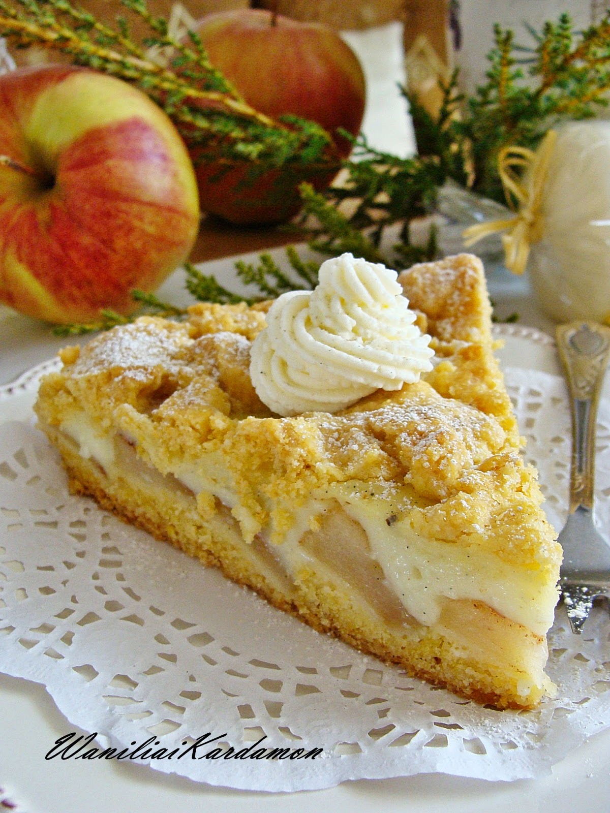 Wykwintna tarta z jabłkami moczonymi w białym winie, z budyniem o smaku…