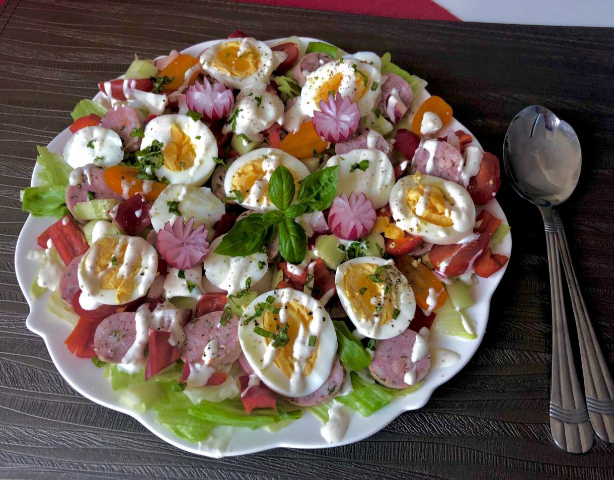 Wielkanocna sałatka Bardzo smaczna sałatka z białą kiełbasą, jajkami, warzywami oraz sosem…