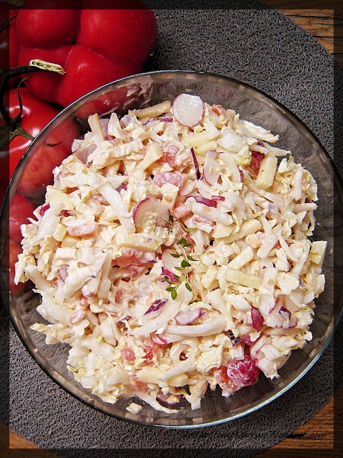 Surówka z kapusty pekińskiej z dodatkiem pomidorów, rzodkiewek, jabłka i cebuli to…