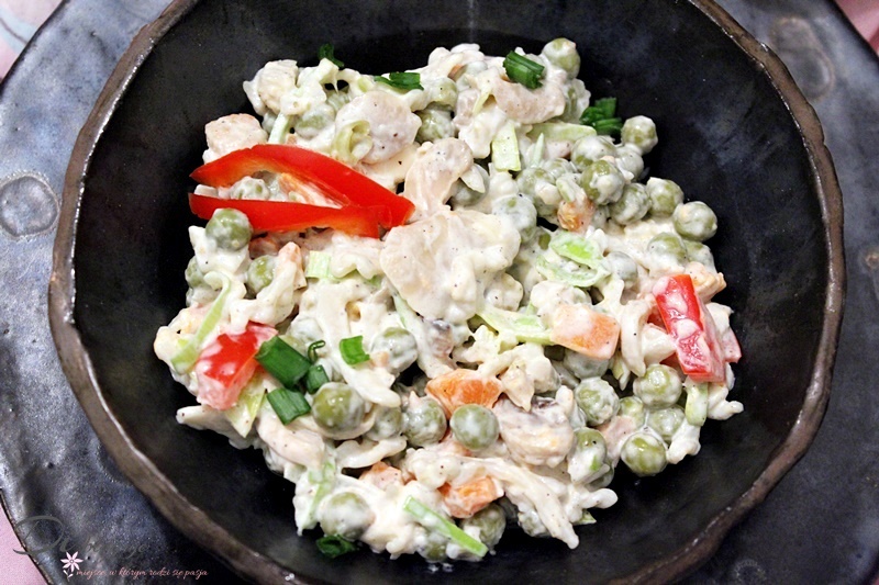 Sałatka warzywna z makaronem i pieczarkami marynowanymi to idealna propozycja na szybką oraz pożywną sałatkę, która może również zastąpić lekki obiad lub kolację.Sałatkę można wzbogacić o inne warzywa oraz też ser żółty, szynkę lub kurczaka, ale w zaprezentowanej wersji także dobrze smakuje.U nas