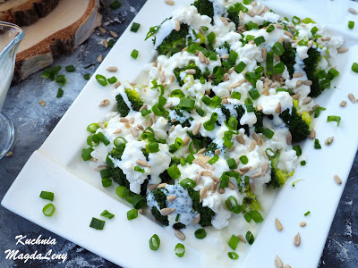Sałatka z brokułami i serkiem wiejskim, z dodatkiem ziaren słonecznika oraz szczypiorku,…