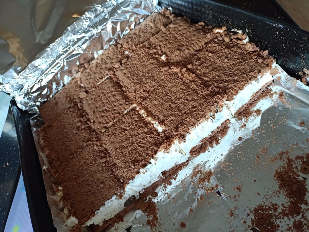 herbatniki kakaowe ok .250gkremówka 500mlmascarpone 500g2 łyżki cukru pudru2 cukry waniliowe2 łyżeczki żelatyny