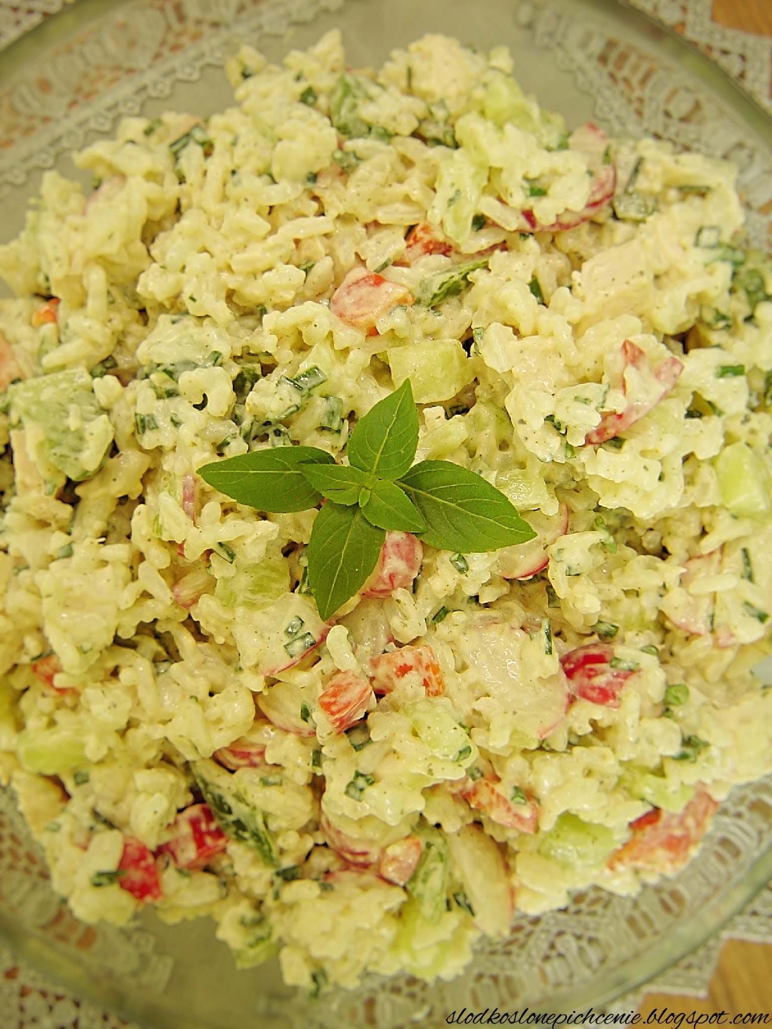 Prosty i szybki przepis na kolorową sałatkę ryżową z dodatkiem kurczaka gotowanego w bulionie, rzodkiewek i ogórka.