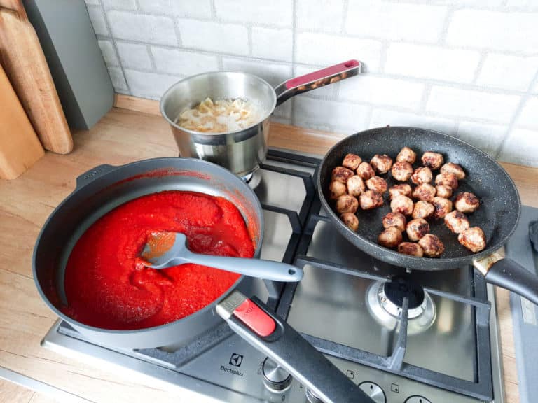 Zarumienione mięsne pulpeciki z intensywnie pomidorowym sosem z pomidorów z puszki, podane…