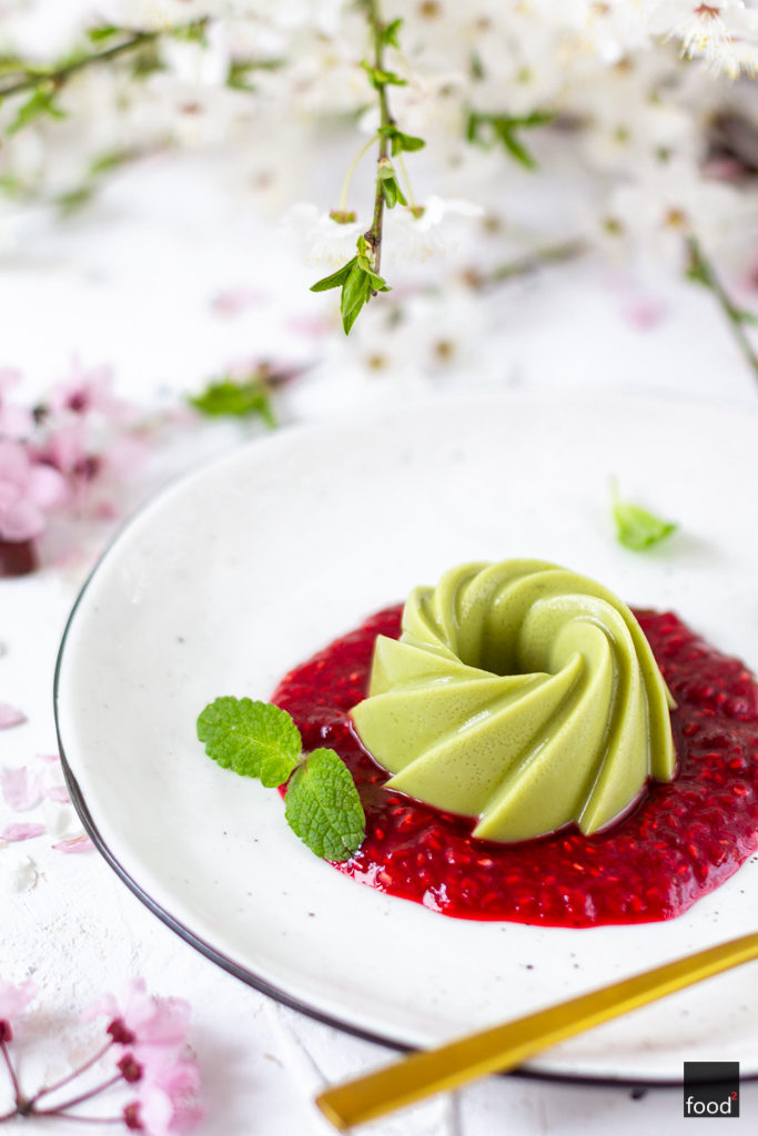 Kokosowa panna cotta z zieloną herbatą matcha i sosem malinowym