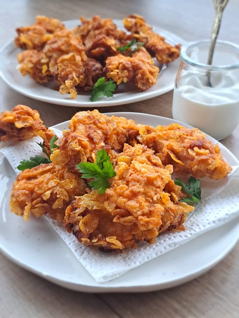 Domowe nuggetsy z kurczaka w chrupiącej panierce z płatków kukurydzianych. Soczyste mięso,…