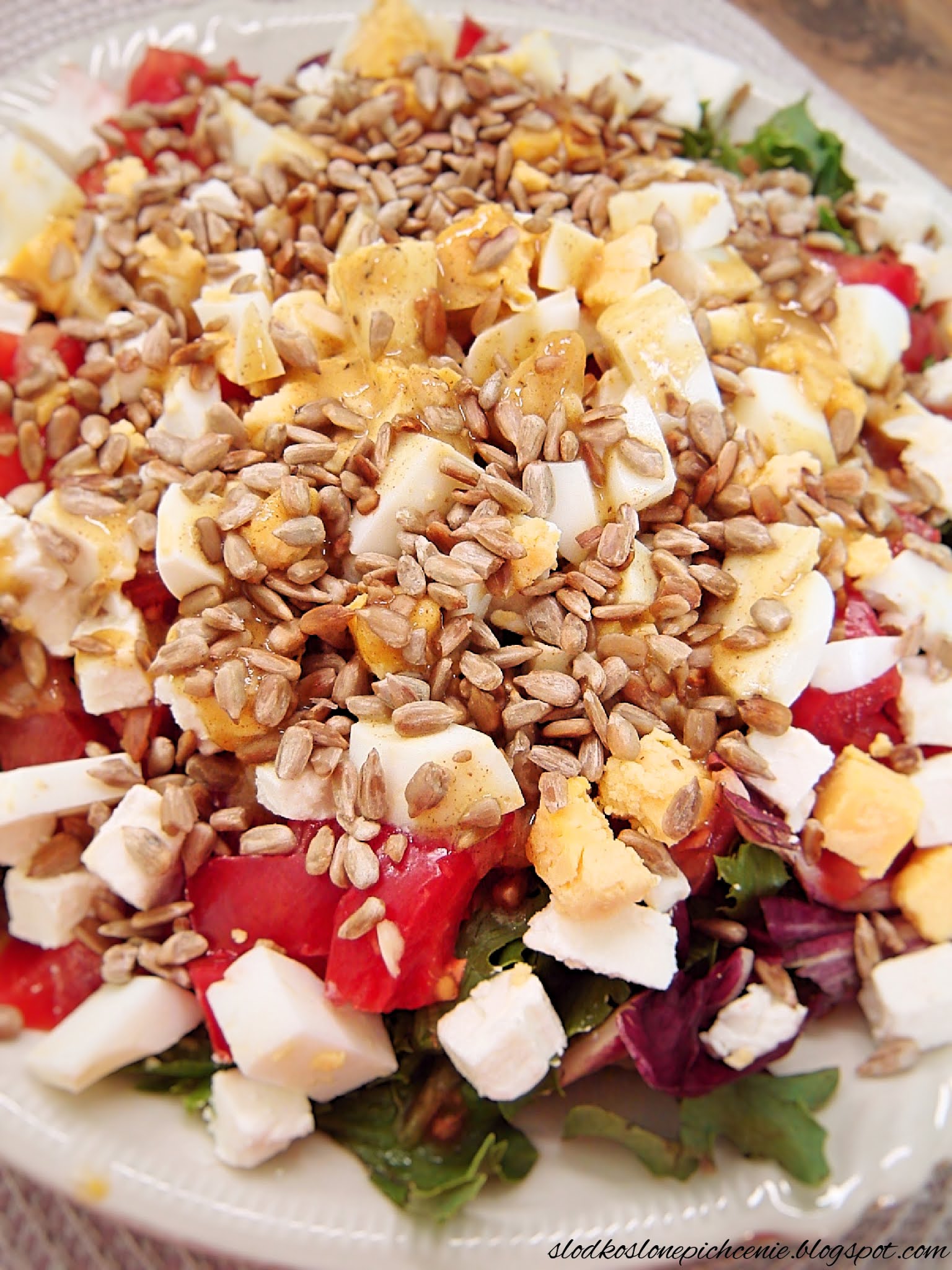 Pyszna i pożywna sałatka z fetą, jajkiem i pomidorem, z dodatkiem pysznego, miodowo-musztardowego sosu.