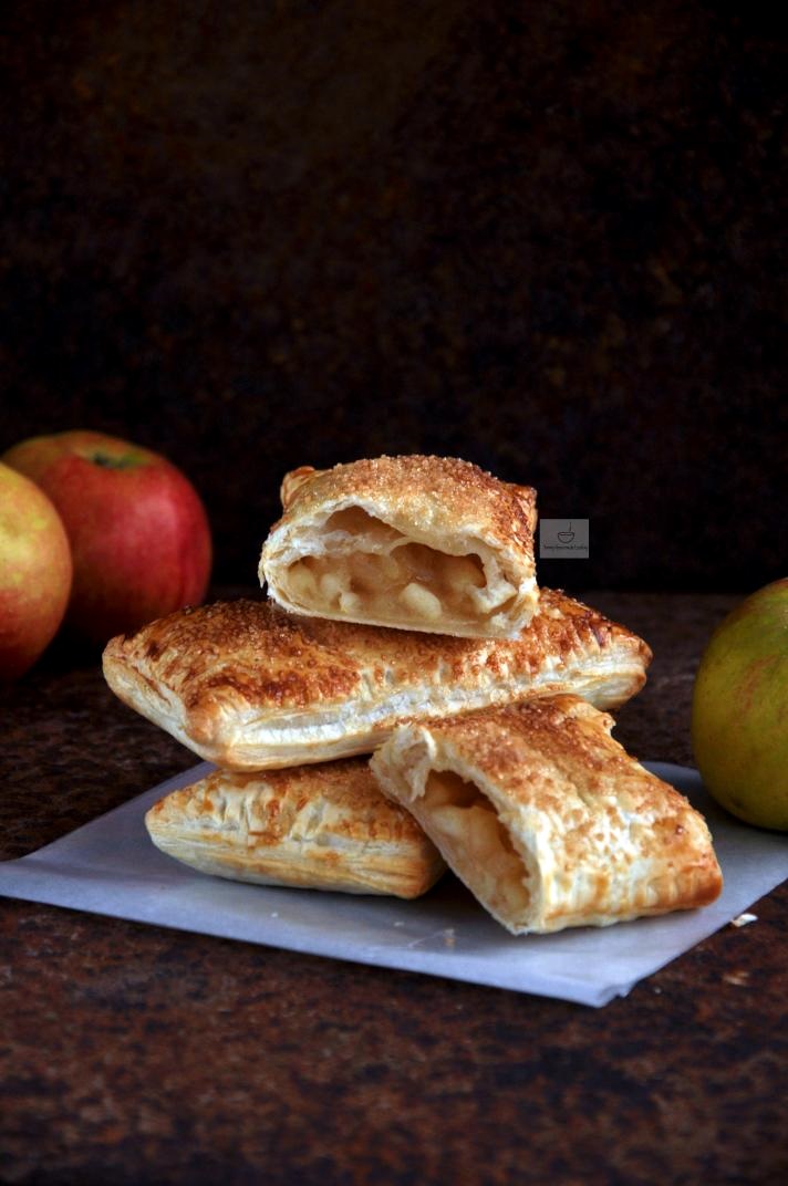 Szybkie ciastka z ciasta francuskiego z nadzieniem jabłkowym. Coś na kształt podawanych w jednej z fastfoodowych restauracji z tym, że dużo zdrowsze pomimo cukru i pszenicy. Gdy więc najdzie Was ochota to zamiast zamówić polecam wykonać własnoręcznie. Przepis banalnie łatwy więc nawet dzieci sobie z nim poradzą 🙂