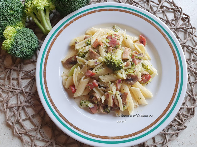 Bardzo lubię połączenie makaronu z brokułem. Dziś zaserwowałam moim domownikom wersję wzbogaconą o chrupiący boczek i podsmażone pieczarki. Powstało bardzo sycące, smaczne i proste danie. Polecam 🙂