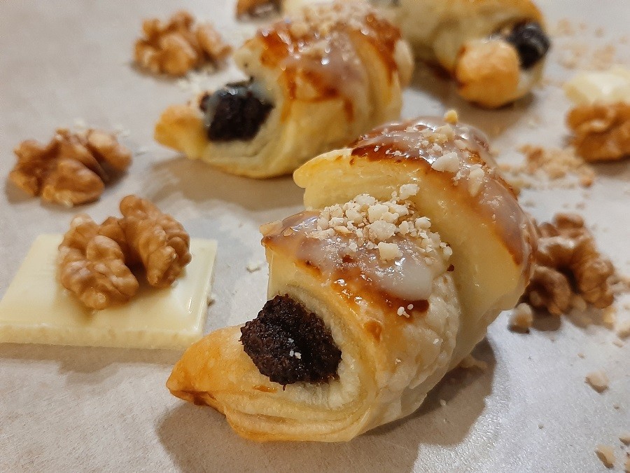 Malutkie, słodkie, pyszne rogaliki z ciasta francuskiego, z makiem i polewą z białej czekolady doskonale się sprawdzą jako szybki deser, gdy masz mało czasu, za to dużą ochotę na coś słodkiego. Możesz je dodatkowo posypać siekanymi orzechami i rozkoszować się jeszcze ciepłymi rogalikami prosto z piekarnika 🙂