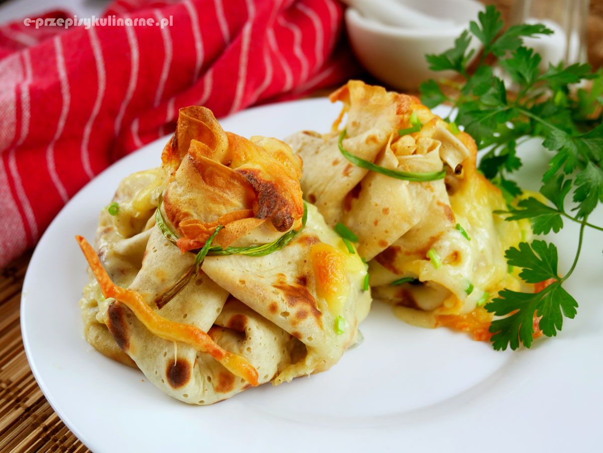Składniki na sakiewki z naleśników zapiekane w sosie serowym (12 sztuk):